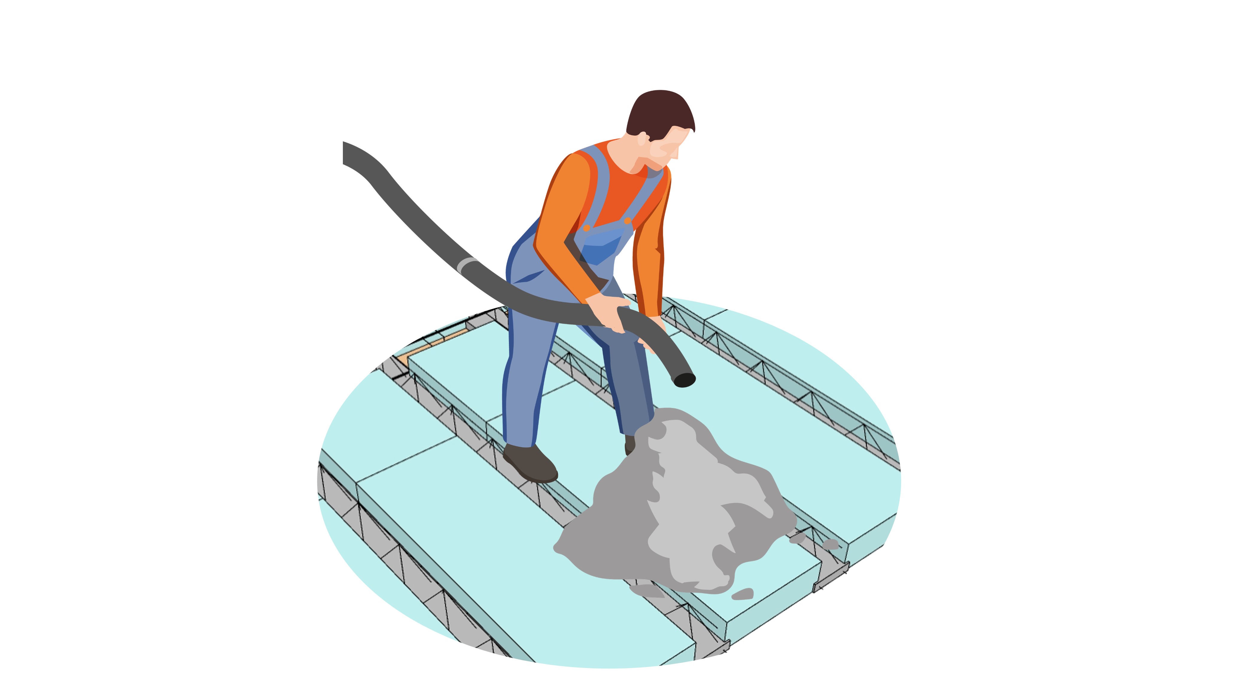Para laje com EPS, o concreto deve ser lançado à uma altura de 15 cm a 25 cm. Não deve ser feito acumulo de concreto sobre os EPS, caso o volume ou a vazão de concreto seja alta o mesmo deve ser lançado sobre uma folha de madeira compensado.